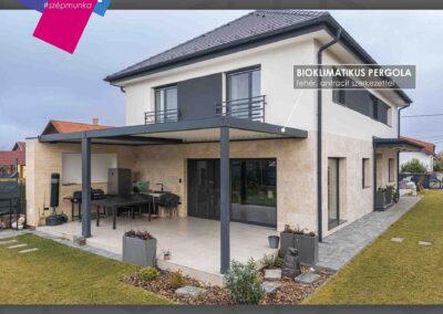 Pilisvörösváron egy olyan bioklimatikus pergolát valósítottunk meg, ahol a tervezés középpontjában a BBQ sarok állt. A cél egy egész évben jól használható kültéri tér volt, amely később akár TV-vel is bővíthető, így a grillestek és a baráti összejövetelek új szintre léphetnek.