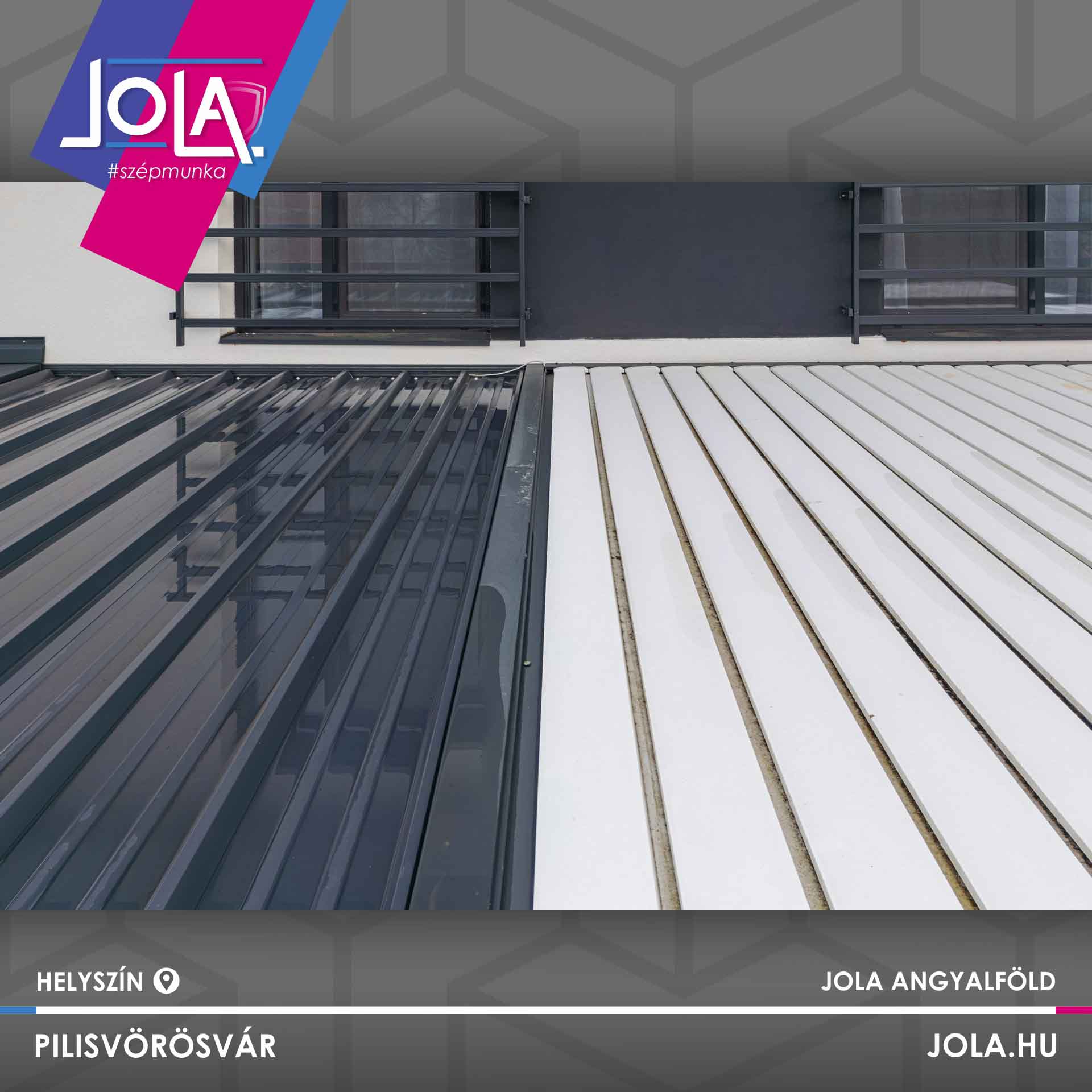 A fehér lamellák és az antracit szerkezet letisztult, modern megjelenést adnak, tökéletesen illeszkedve az épület stílusához.